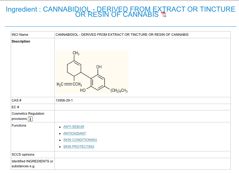 Agora, o banco de dados CosIng apresenta o CBD natural do cânhamo e o CBD natural das folhas do cânhamo como dois ingredientes cosméticos. Embora o catálogo não seja juridicamente vinculativo, mas sim concebido para servir um propósito informativo para a indústria, serviu de orientação para os Estados-Membros porque o seu propósito final era harmonizar a comercialização de produtos cosméticos em toda a Europa.