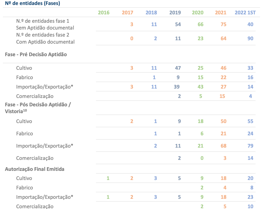 No total, o Infarmed atribuíu 172 pré-licenças, distribuídas pelas actividades de cultivo (55 pedidos de licenciamento), importação/exportação (79 pedidos de licenciamento), fabrico (24 pedidos de licenciamento) e comercialização (10 pedidos de licenciamento).(Ver quadro abaixo)