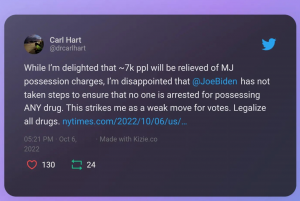Em reacção ao anúncio de Joe Biden, que ontem revelou as suas intenções de reclassificar a canábis e perdoar as ofensas por posse e consumo de canábis a nível federal, o cientista e Professor Universitário Carl Hart confessou-se “desapontado” que não tenham sido tomadas medidas para “garantir que ninguém seja preso por possuir QUALQUER droga”. Na sua conta do Twitter, Hart apelou a Biden para legalizar todas as substâncias.