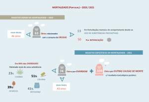 Dos 413 óbitos com substâncias ilícitas/metabolitos e informação da causa de morte, 74 (18%) foram overdoses, que aumentaram 45% face a 2020, representando o valor mais elevado desde 2009. Os valores registados nos últimos quatro anos de overdoses com cocaína e de overdoses com opiáceos foram os mais altos desde 2011. Na grande maioria das overdoses (84%) havia mais do que uma substância, destacando-se, associadas às drogas ilícitas, as benzodiazepinas (58%) e o álcool (22%). É importante realçar que no que toca aos dados relativos a mortes por overdose onde foi detectada canábis, em todas elas existia sempre a presença de outras substâncias, tais como o álcool e opiáceos.